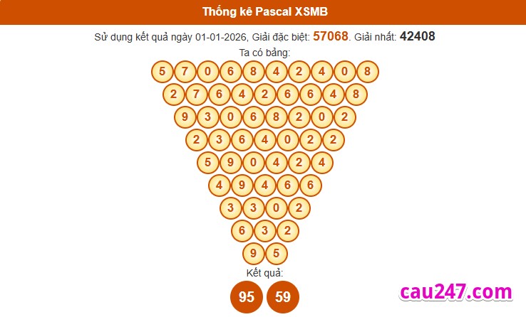 Dựa vào kết quả giải đặc biệt và giải nhất. Bằng phương pháp soi cầu Pascal chúng ta chọn ra được cặp số đẹp và có tỷ lệ về cao cho XSMB ngày 02-01-2026 :