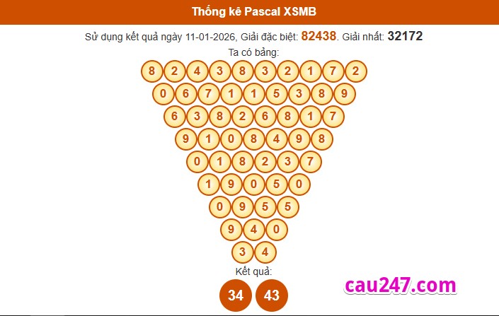 Dựa vào kết quả giải đặc biệt và giải nhất. Bằng phương pháp soi cầu Pascal chúng ta chọn ra được cặp số đẹp và có tỷ lệ về cao cho XSMB ngày 12-01-2026 :