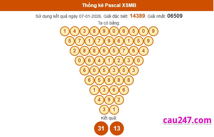 Dựa vào kết quả giải đặc biệt và giải nhất. Bằng phương pháp soi cầu Pascal chúng ta chọn ra được cặp số đẹp và có tỷ lệ về cao cho XSMB ngày 08-01-2026 :