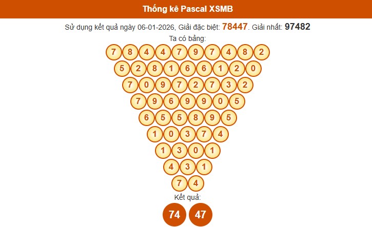 Dựa vào kết quả giải đặc biệt và giải nhất. Bằng phương pháp soi cầu Pascal chúng ta chọn ra được cặp số đẹp và có tỷ lệ về cao cho XSMB ngày 07-01-2026 :
