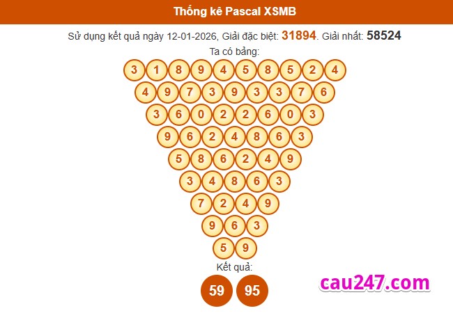 Dựa vào kết quả giải đặc biệt và giải nhất. Bằng phương pháp soi cầu Pascal chúng ta chọn ra được cặp số đẹp và có tỷ lệ về cao cho XSMB ngày 13-01-2026 :