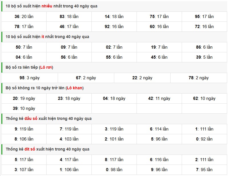 + Bộ số 95: ngày ra gần nhất 12-01-2026, số ngày gan 0 ngày, gan cực đại 32 ngày.
