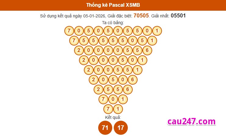 Dựa vào kết quả giải đặc biệt và giải nhất. Bằng phương pháp soi cầu Pascal chúng ta chọn ra được cặp số đẹp và có tỷ lệ về cao cho XSMB ngày 06-01-2026 :
