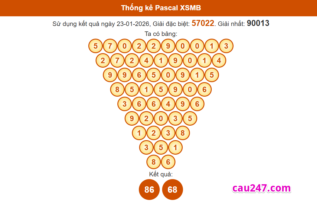 Dựa vào kết quả giải đặc biệt và giải nhất. Bằng phương pháp soi cầu Pascal chúng ta chọn ra được cặp số đẹp và có tỷ lệ về cao cho XSMB ngày 24-01-2026 :
