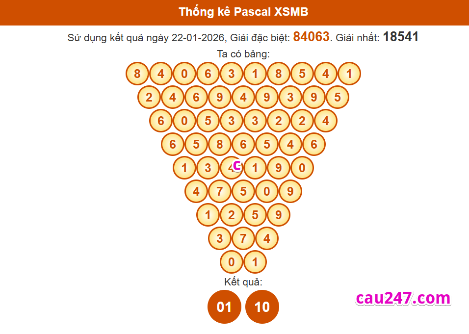 Dựa vào kết quả giải đặc biệt và giải nhất. Bằng phương pháp soi cầu Pascal chúng ta chọn ra được cặp số đẹp và có tỷ lệ về cao cho XSMB ngày 23-01-2026 :