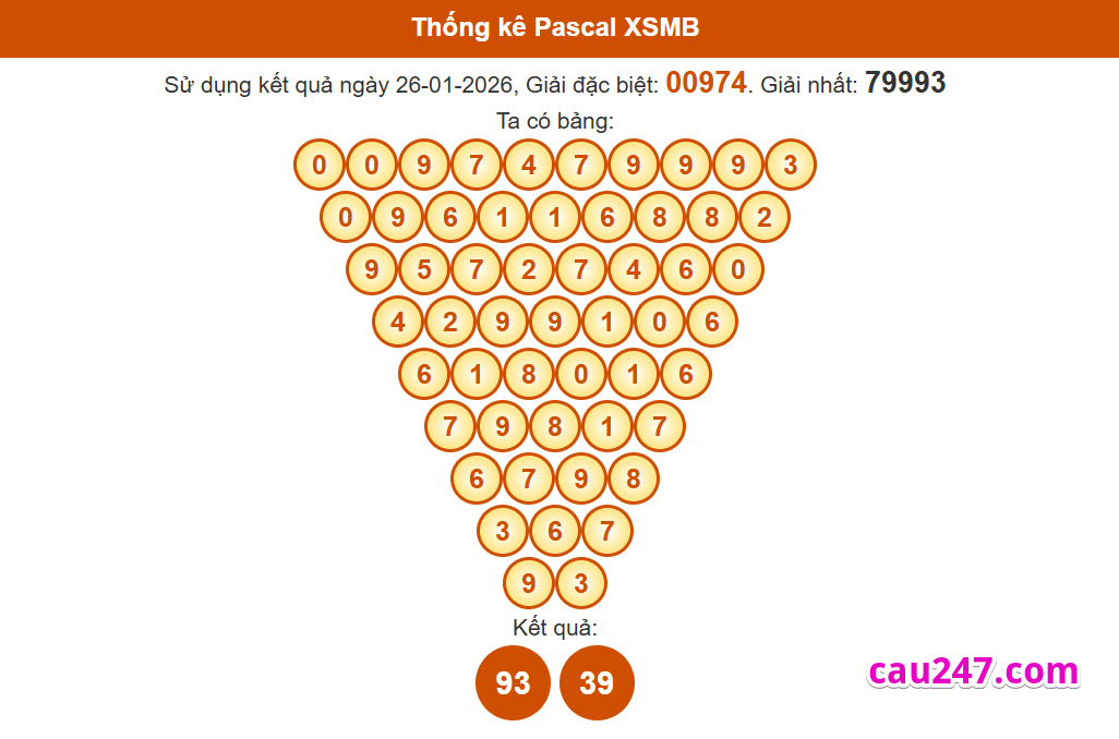 Dựa vào kết quả giải đặc biệt và giải nhất. Bằng phương pháp soi cầu Pascal chúng ta chọn ra được cặp số đẹp và có tỷ lệ về cao cho XSMB ngày 27-01-2026 :