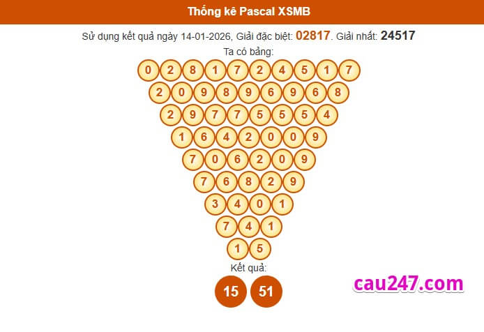 Dựa vào kết quả giải đặc biệt và giải nhất. Bằng phương pháp soi cầu Pascal chúng ta chọn ra được cặp số đẹp và có tỷ lệ về cao cho XSMB ngày 15-01-2026 :