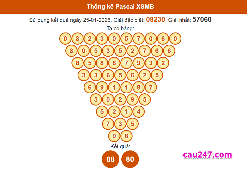 Dựa vào kết quả giải đặc biệt và giải nhất. Bằng phương pháp soi cầu Pascal chúng ta chọn ra được cặp số đẹp và có tỷ lệ về cao cho XSMB ngày 26-01-2026 :